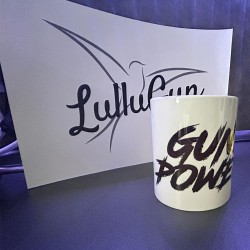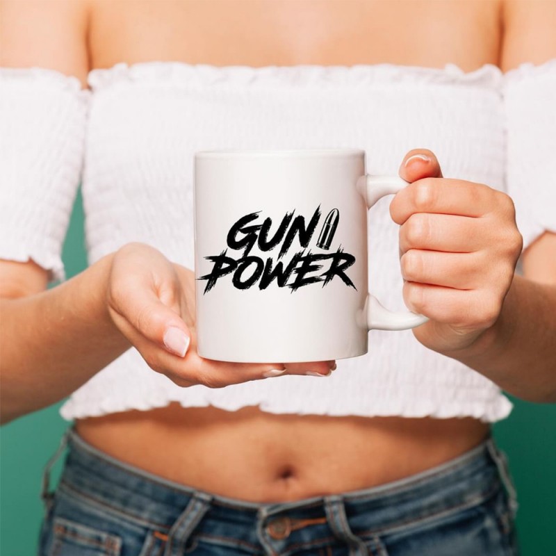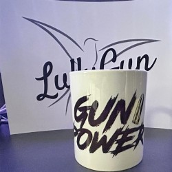 Diese schöne Tasse ist aus Keramik, hat ein Fassungsvolumen von ca. 400 ml und kommt mit meinem Logo "Gun Power" daher.